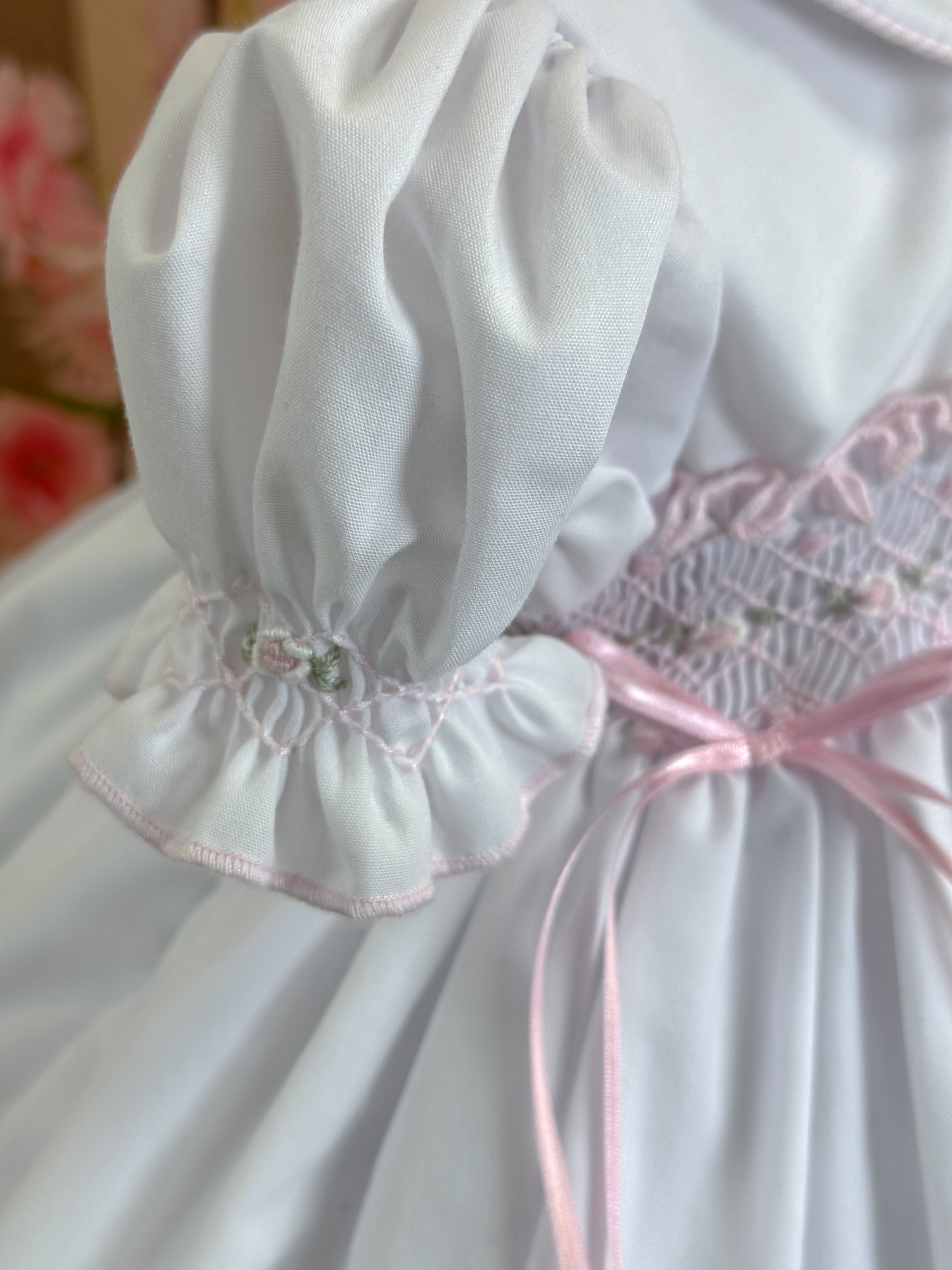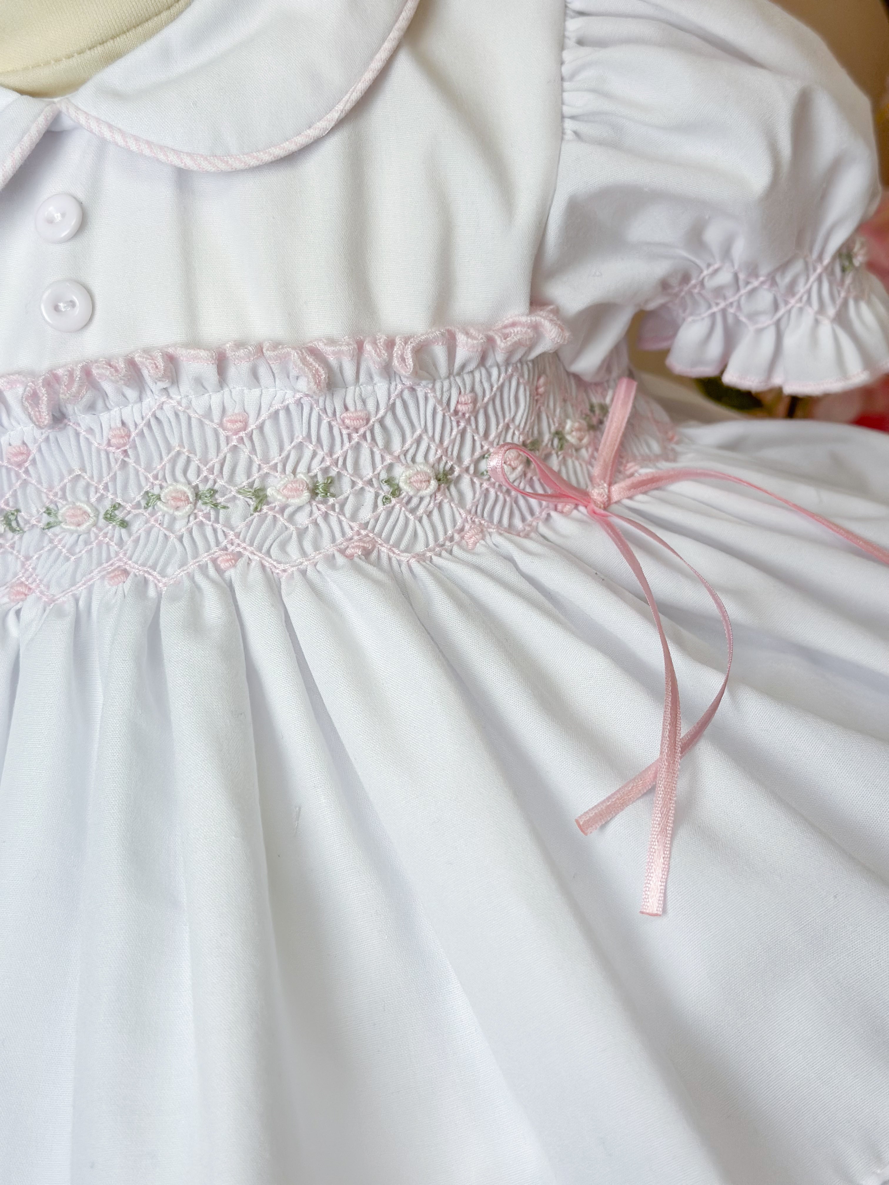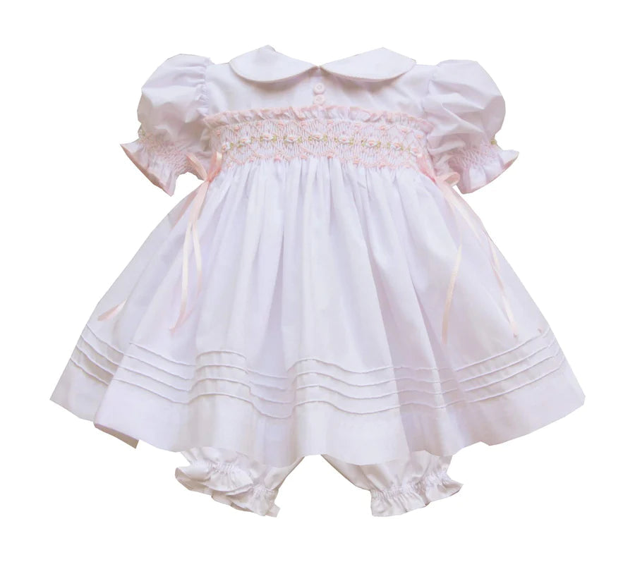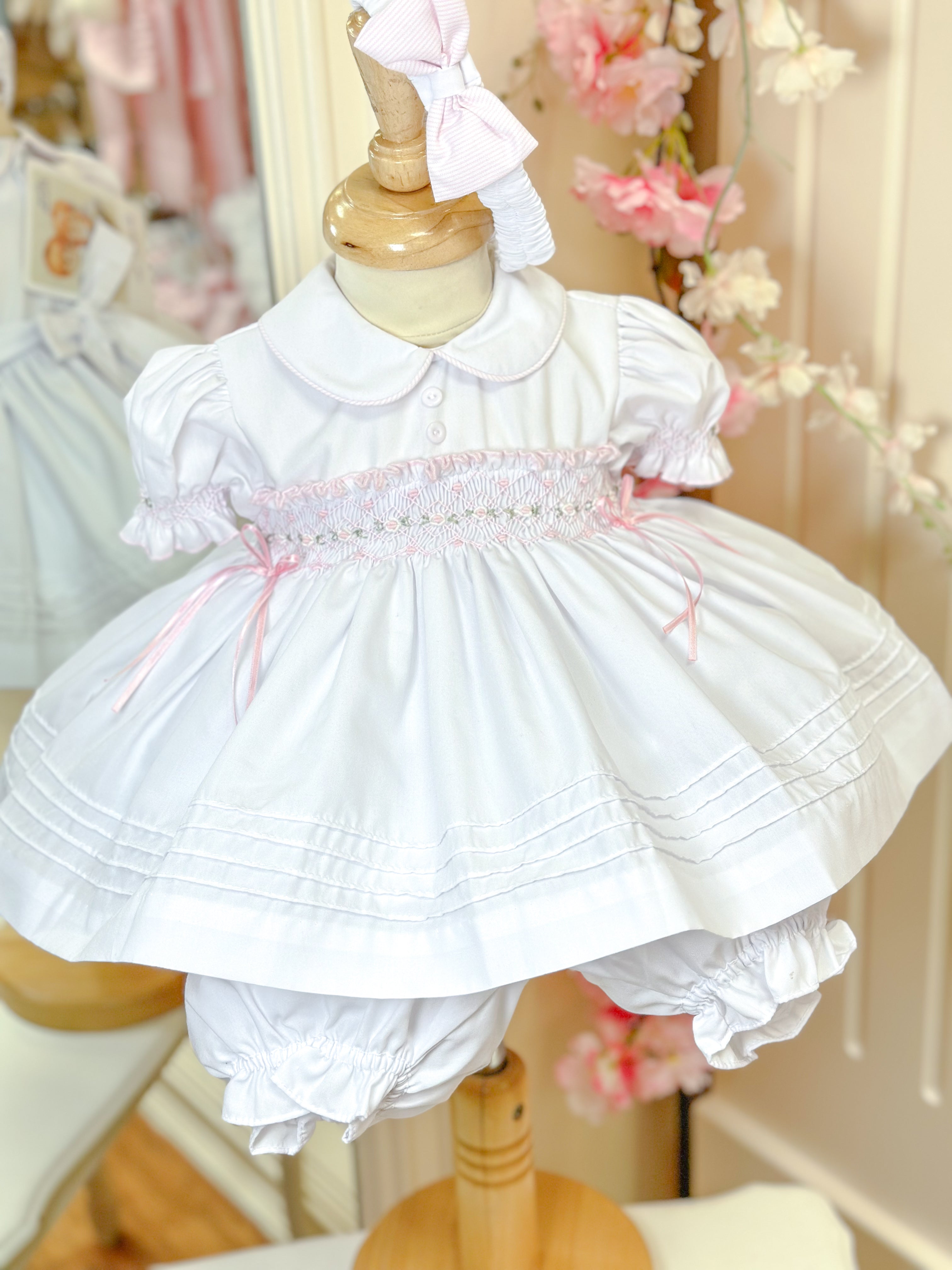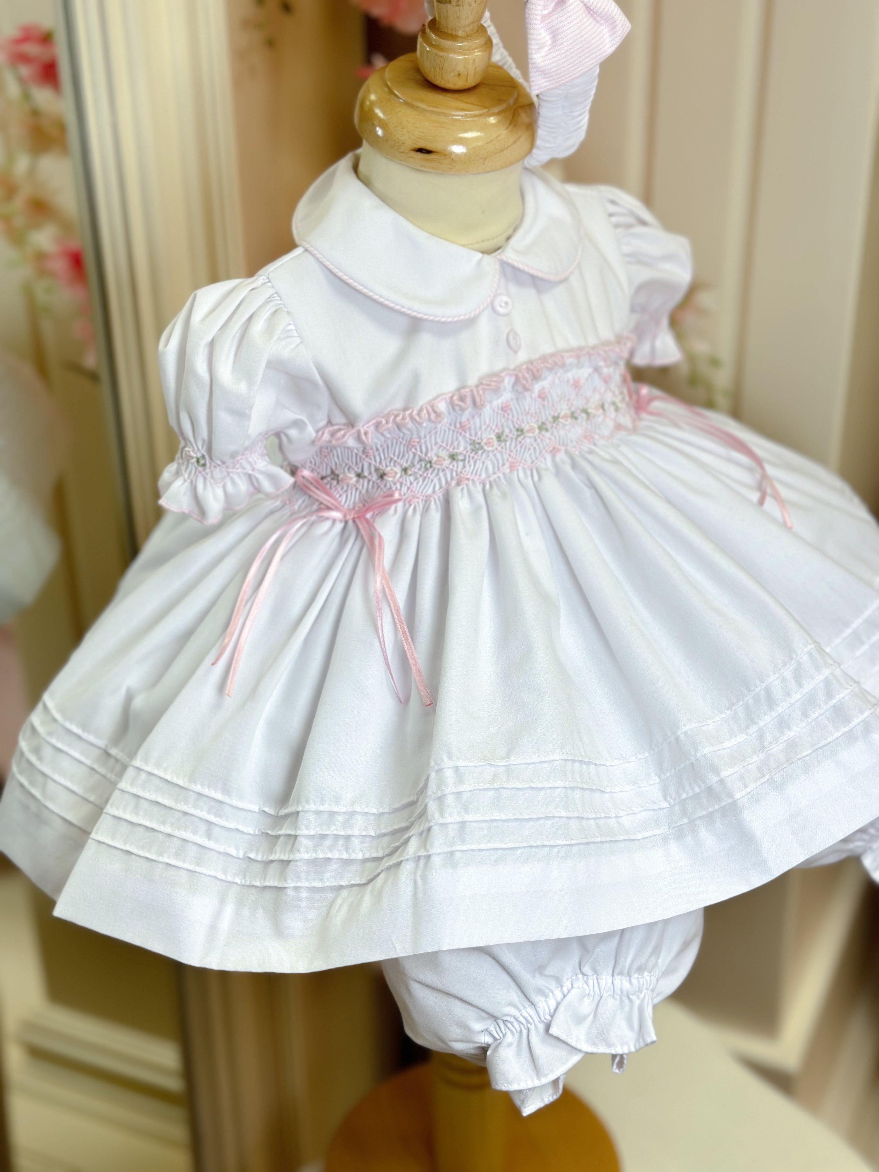 Pretty Originals White/Pink Smock Dress, Bloomers and Headband