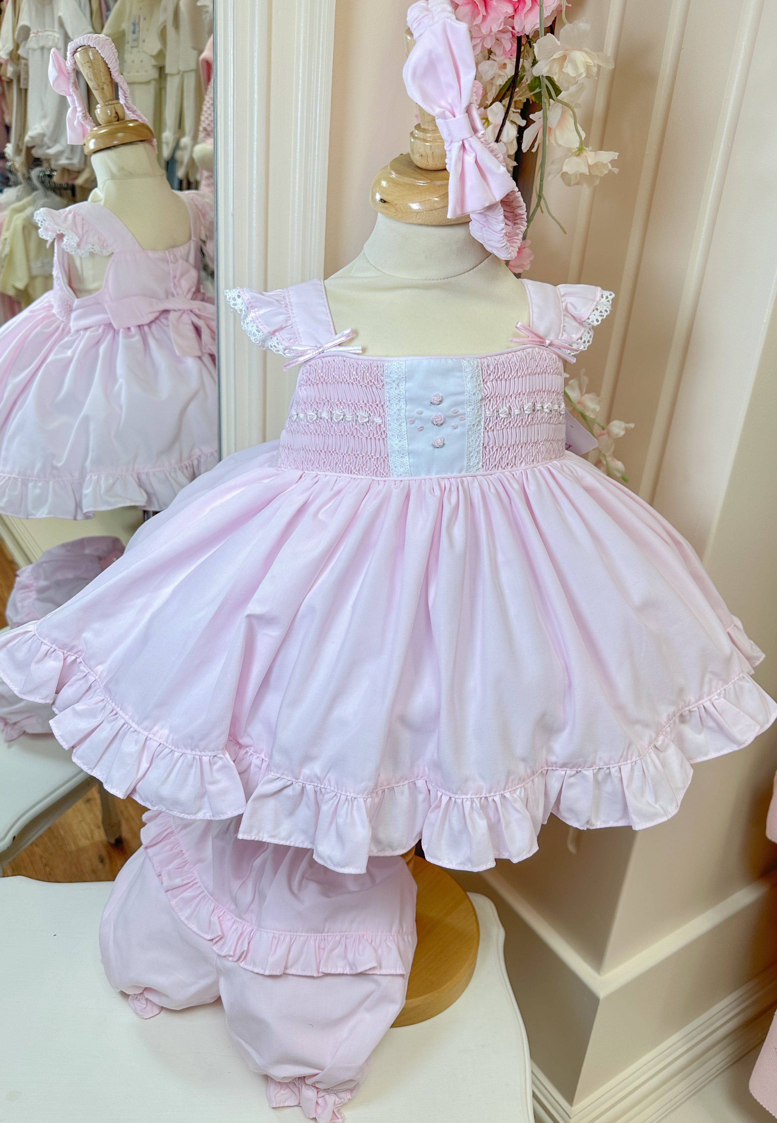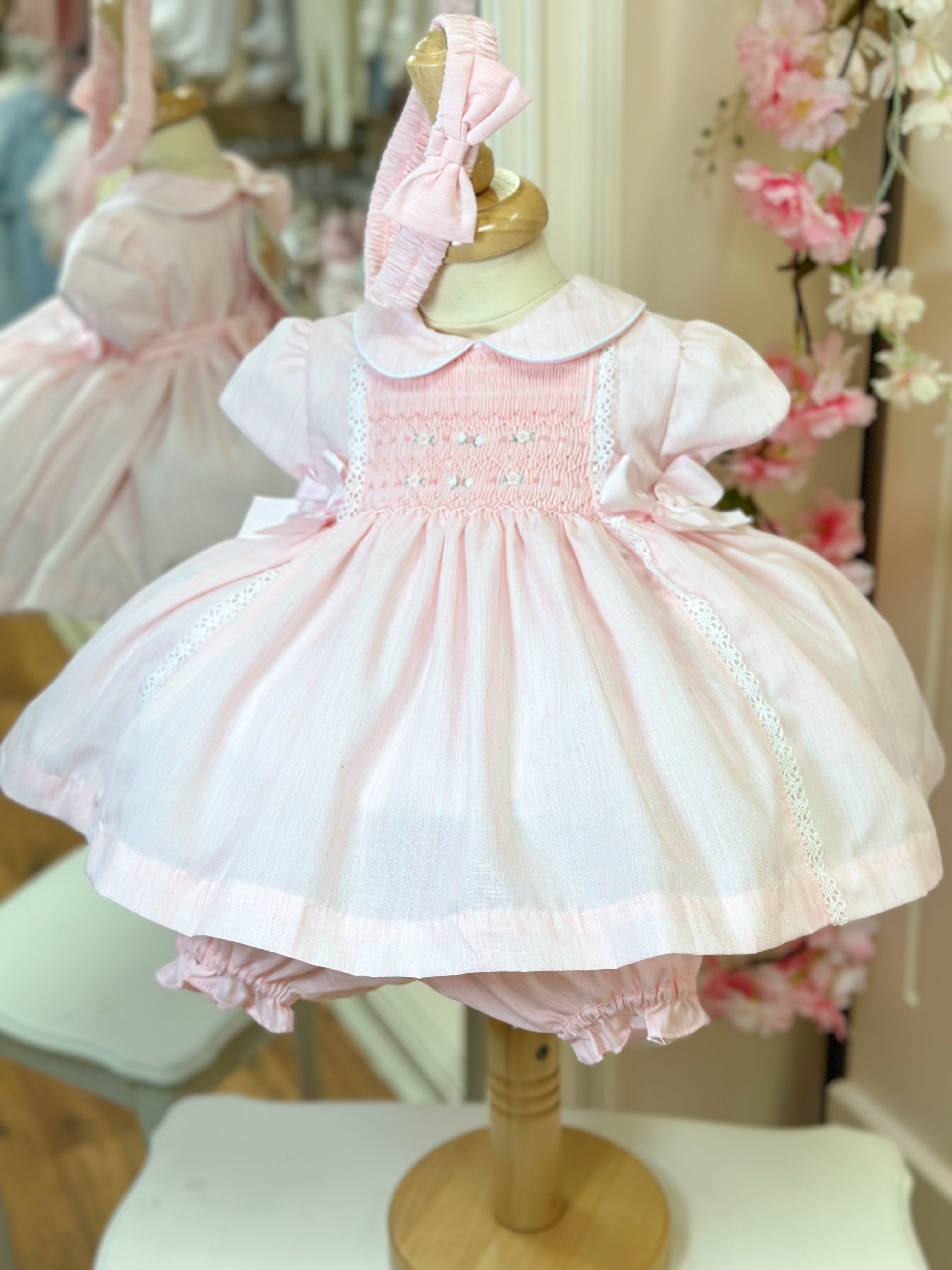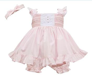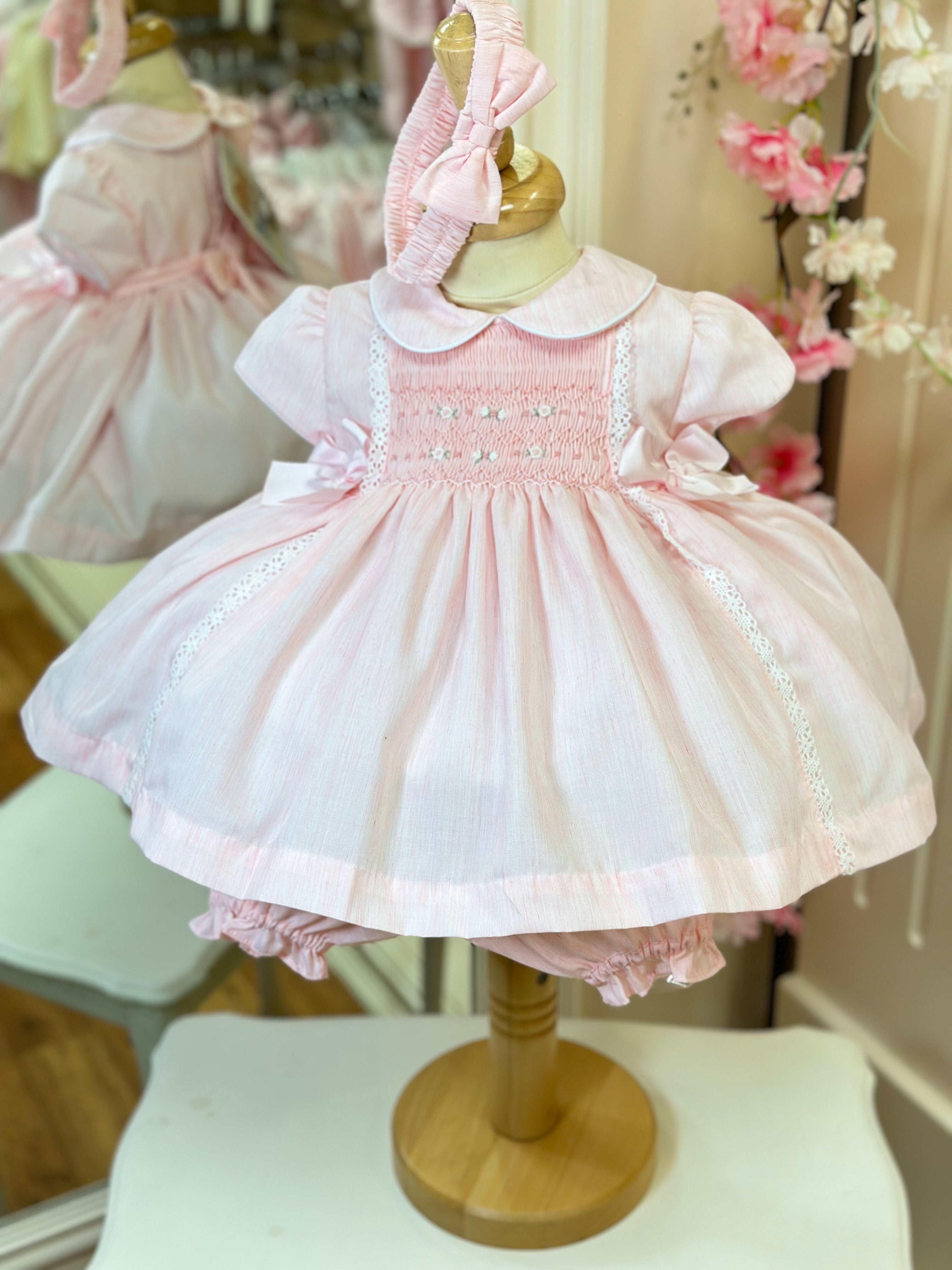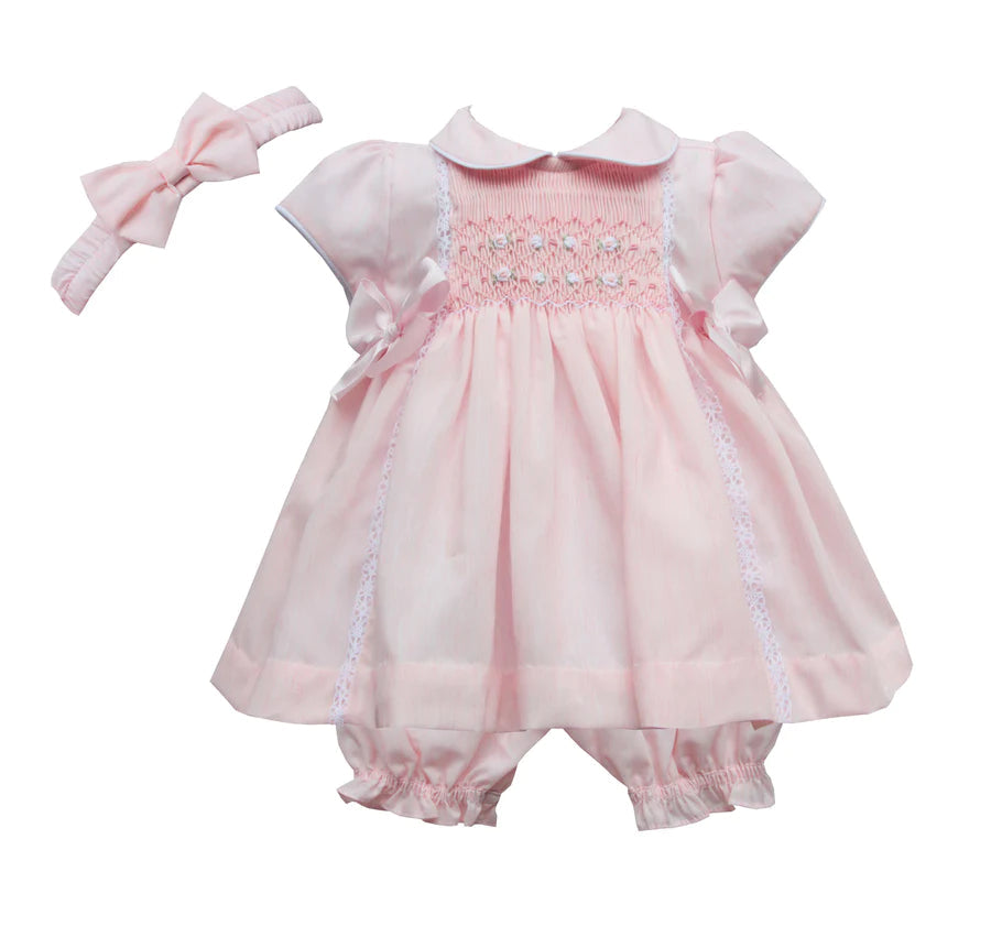Pretty Originals Pink/White Smock Dress, Bloomers and Headband