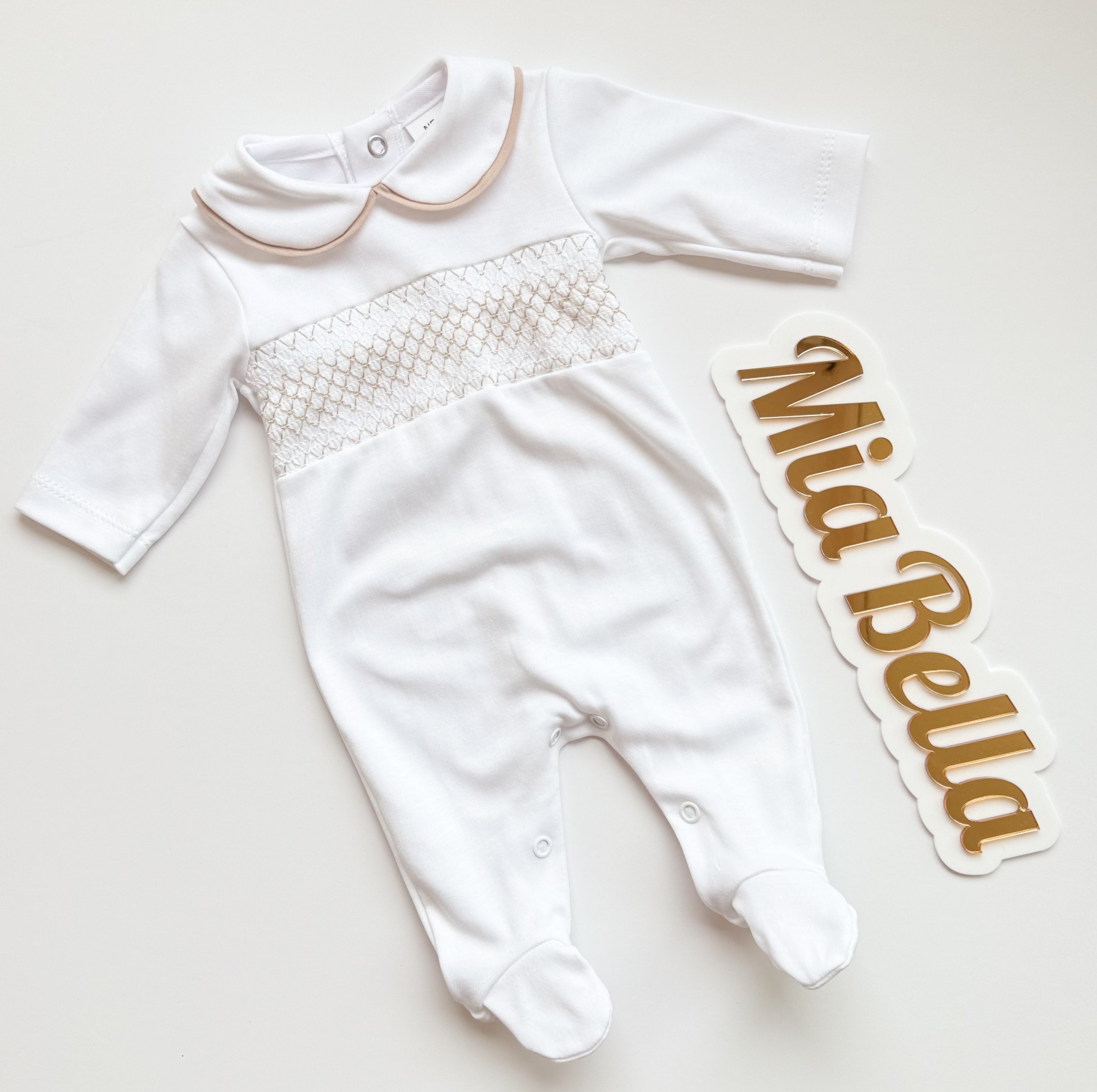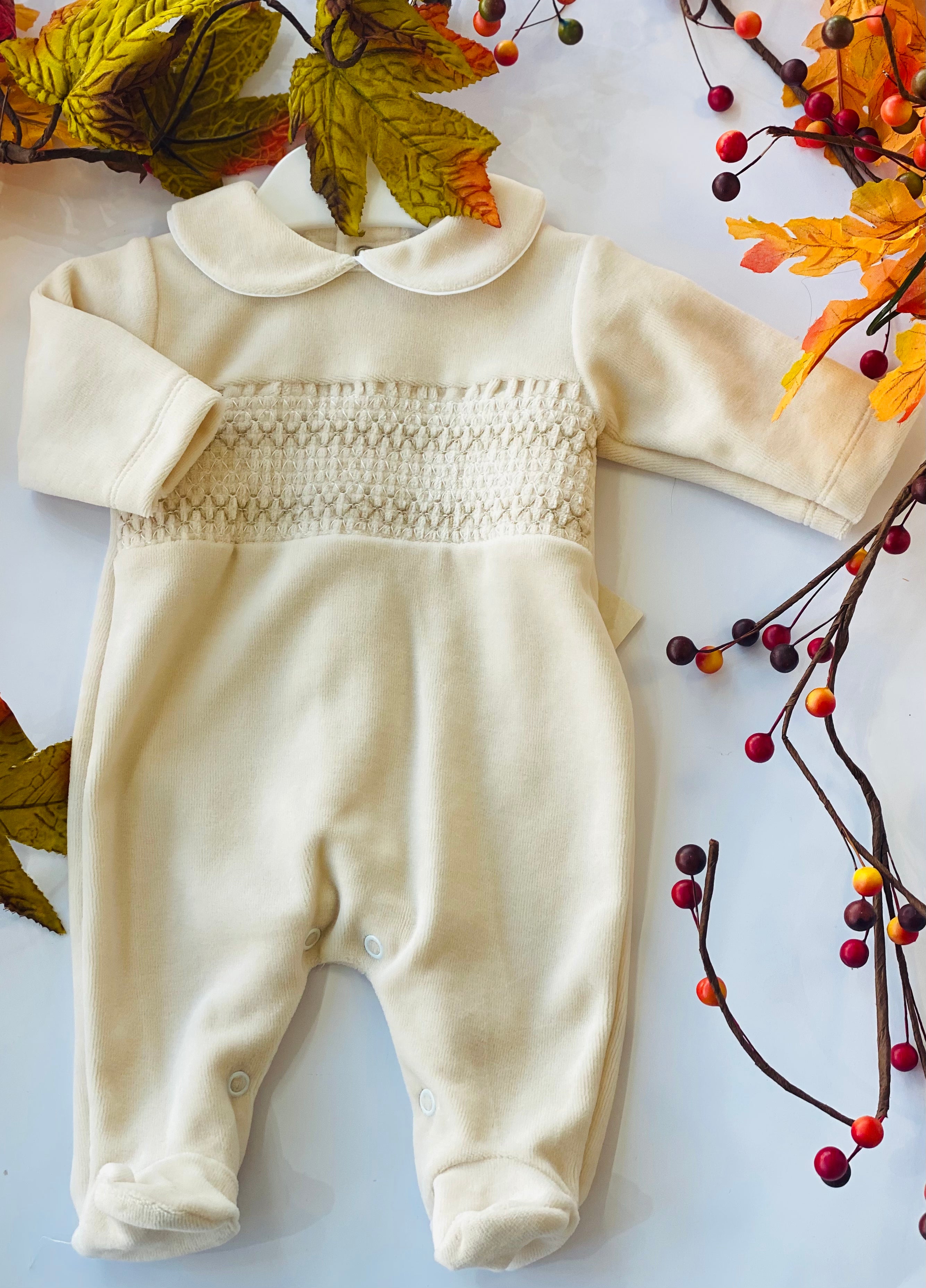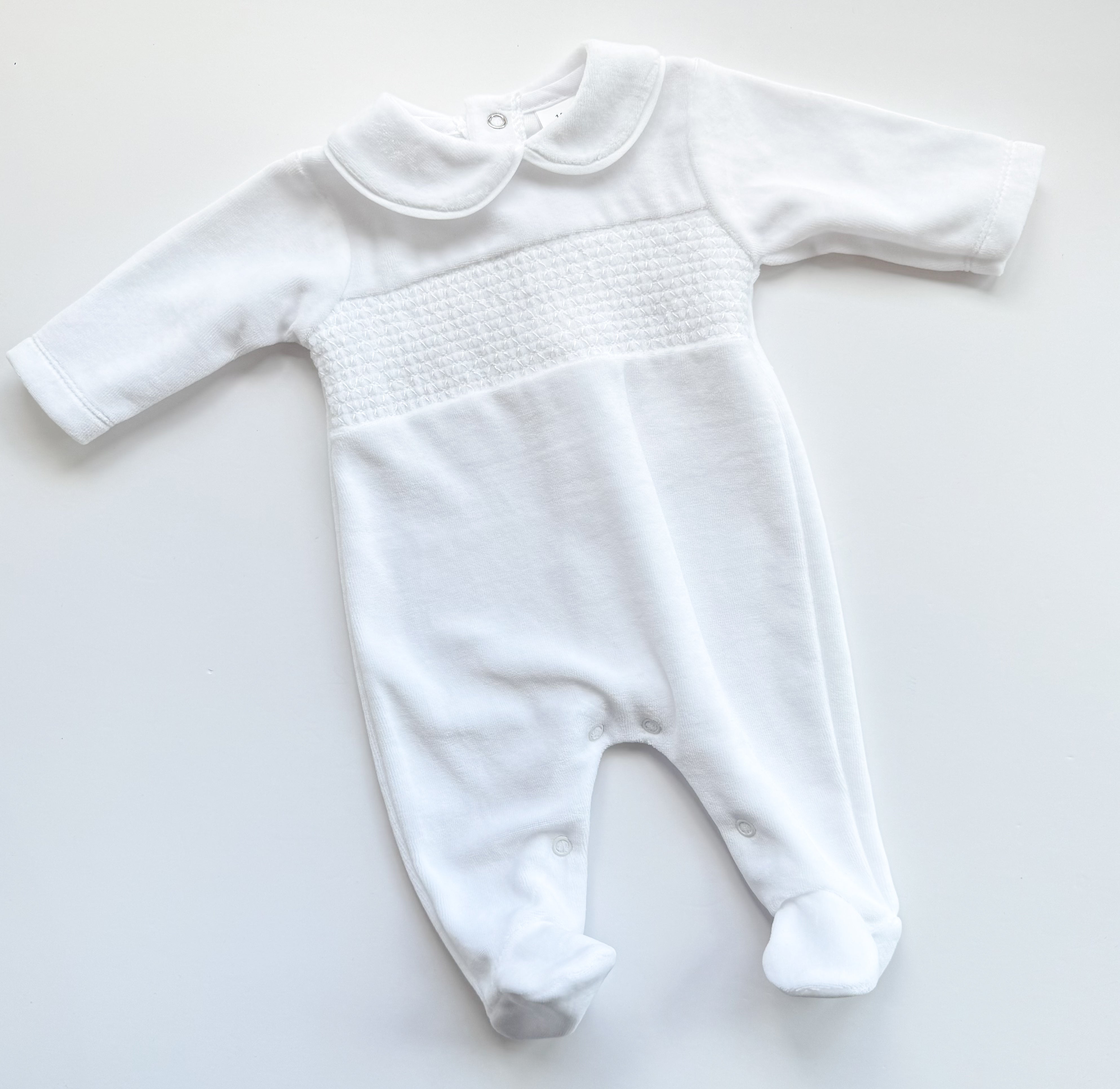 MIA BELLA Luxury Velour Smocked Style BabyGrow White