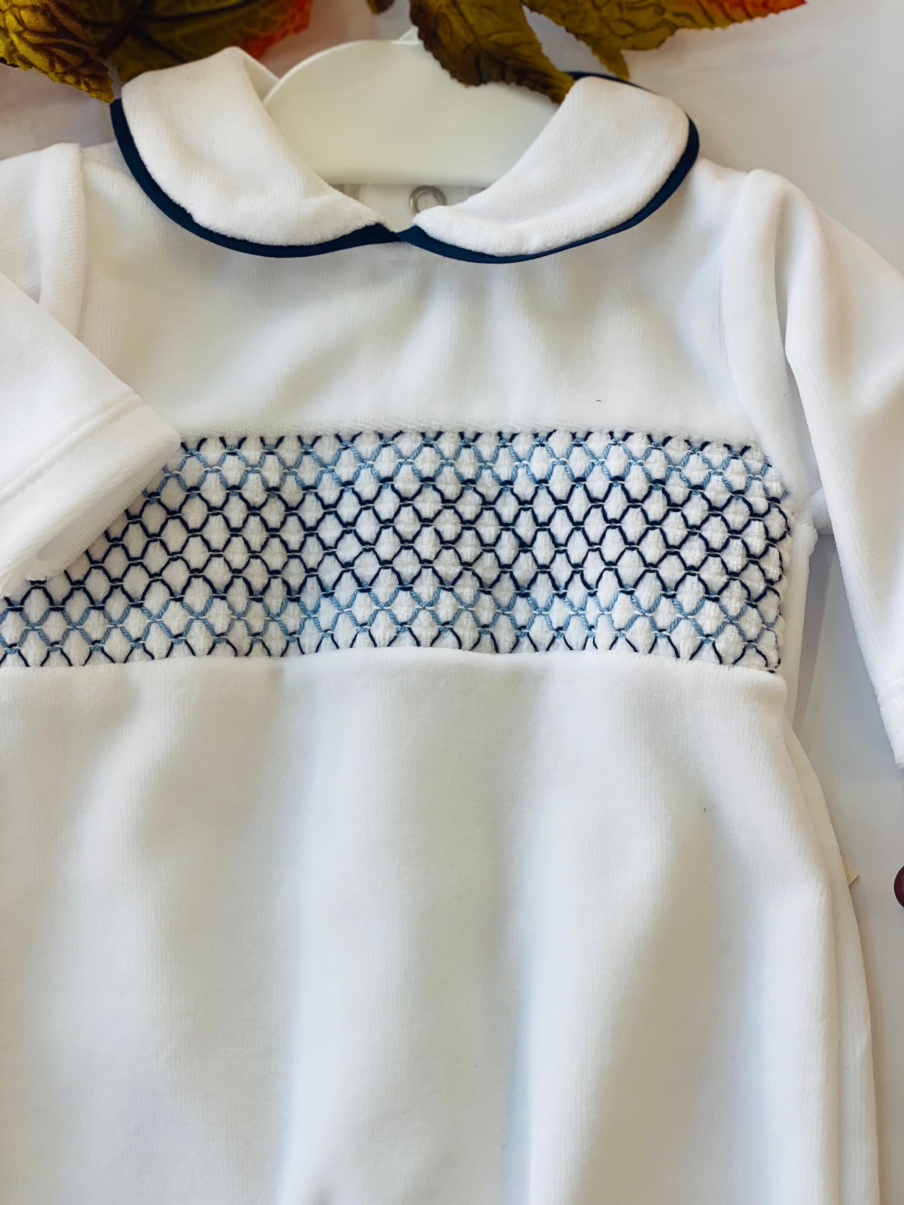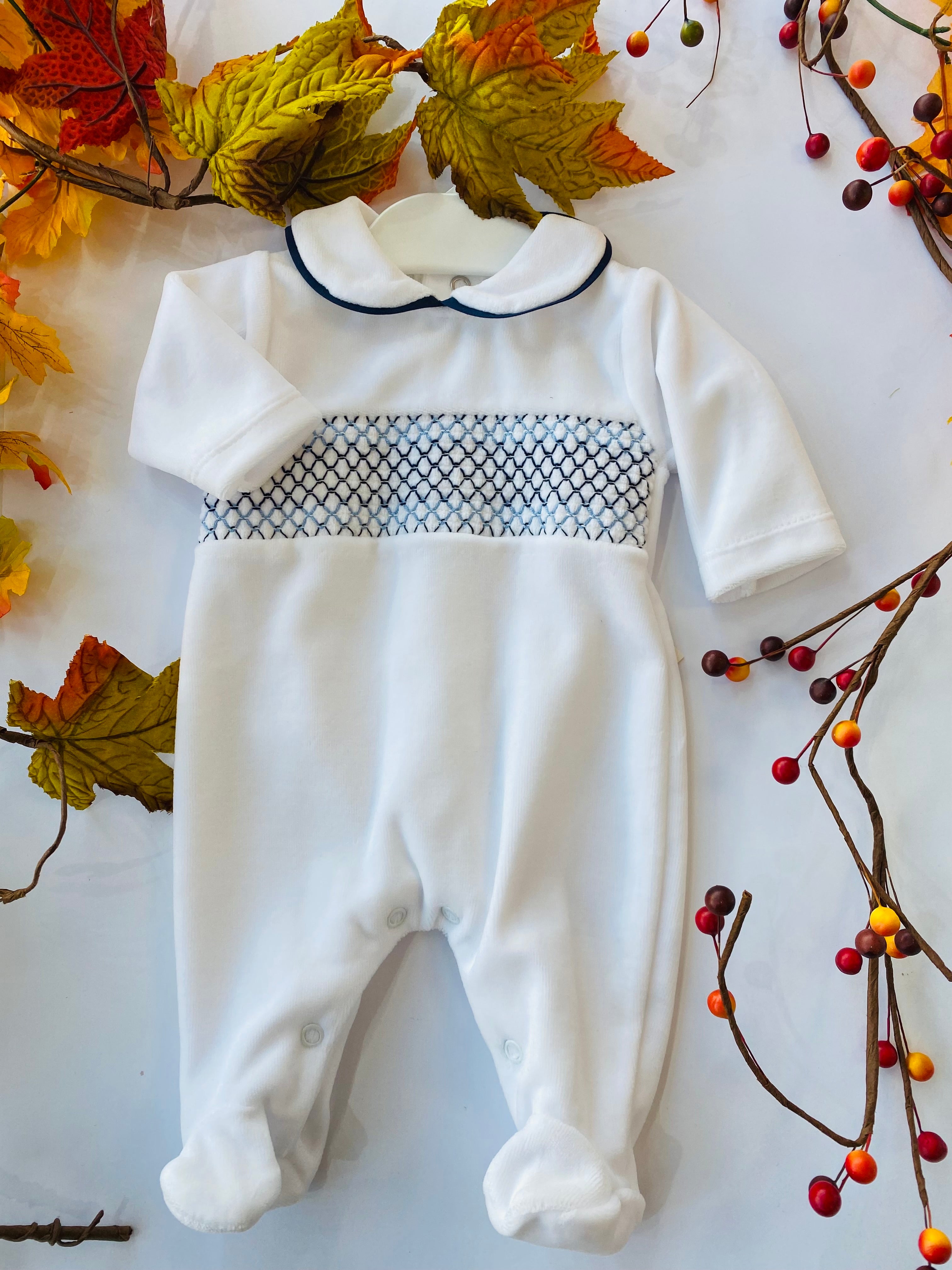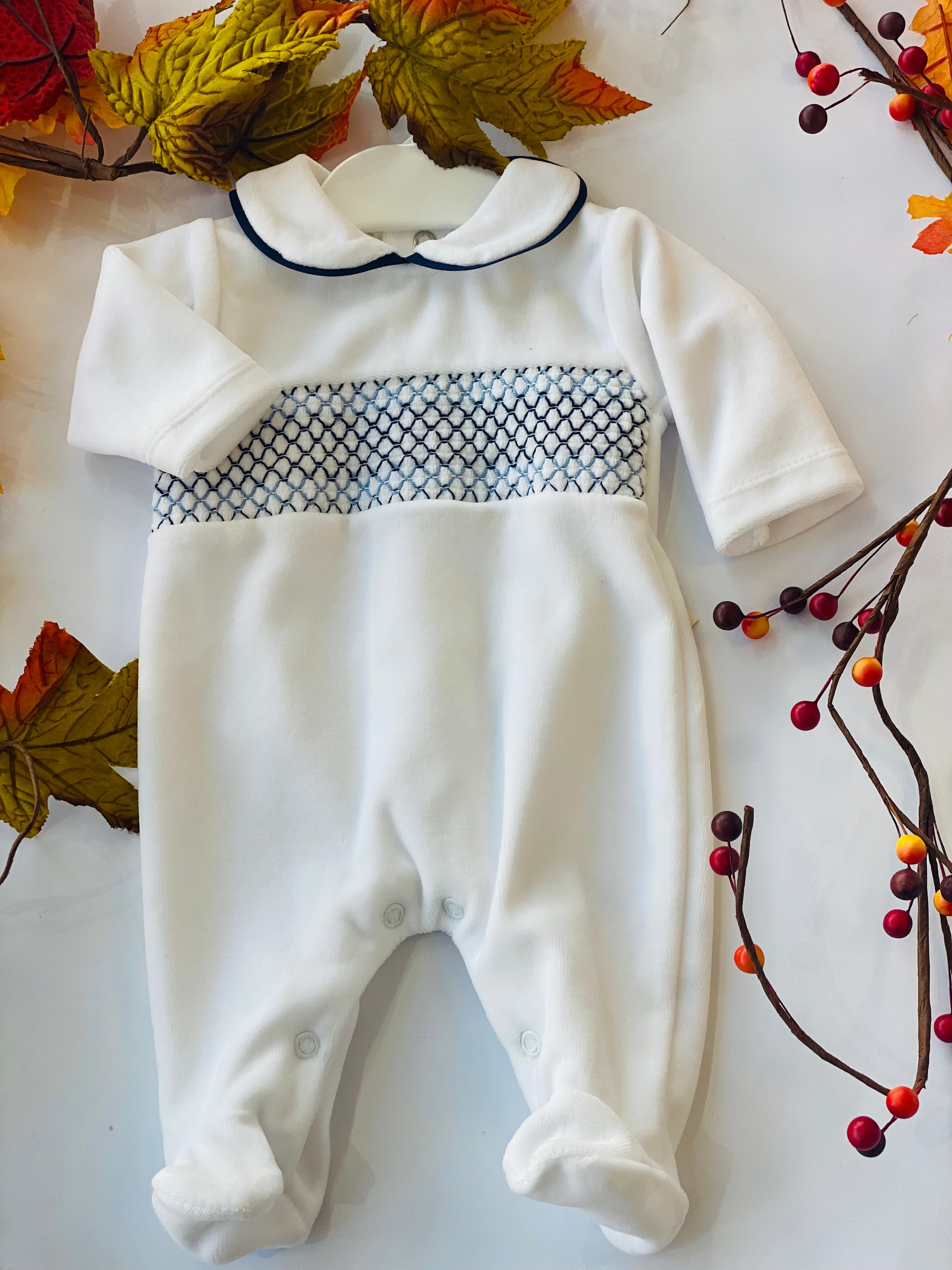 MIA BELLA Luxury Smocked Velour Baby Grow / BabyGrow / White / Navy SG68V