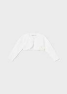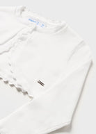 ECOFRIENDS garment, contains sustainable cotton. Long sleeved cardigan for baby. Single button fastening. Made using fine knit fabric that is soft to the touch. Decorative elements: openwork details.