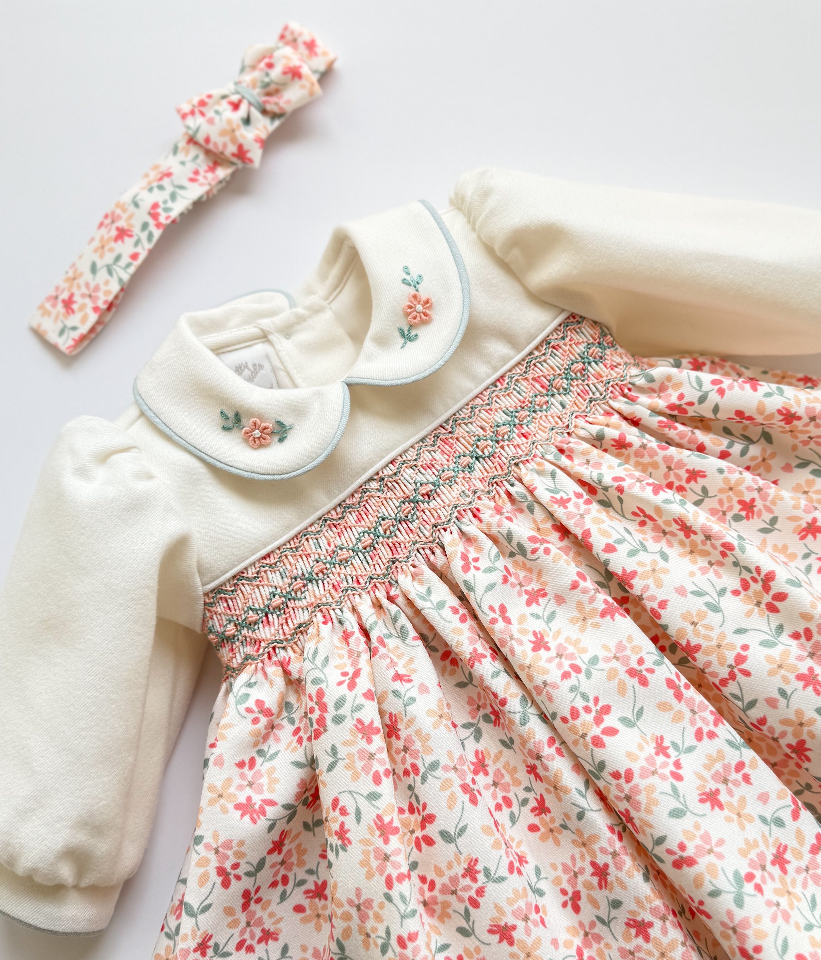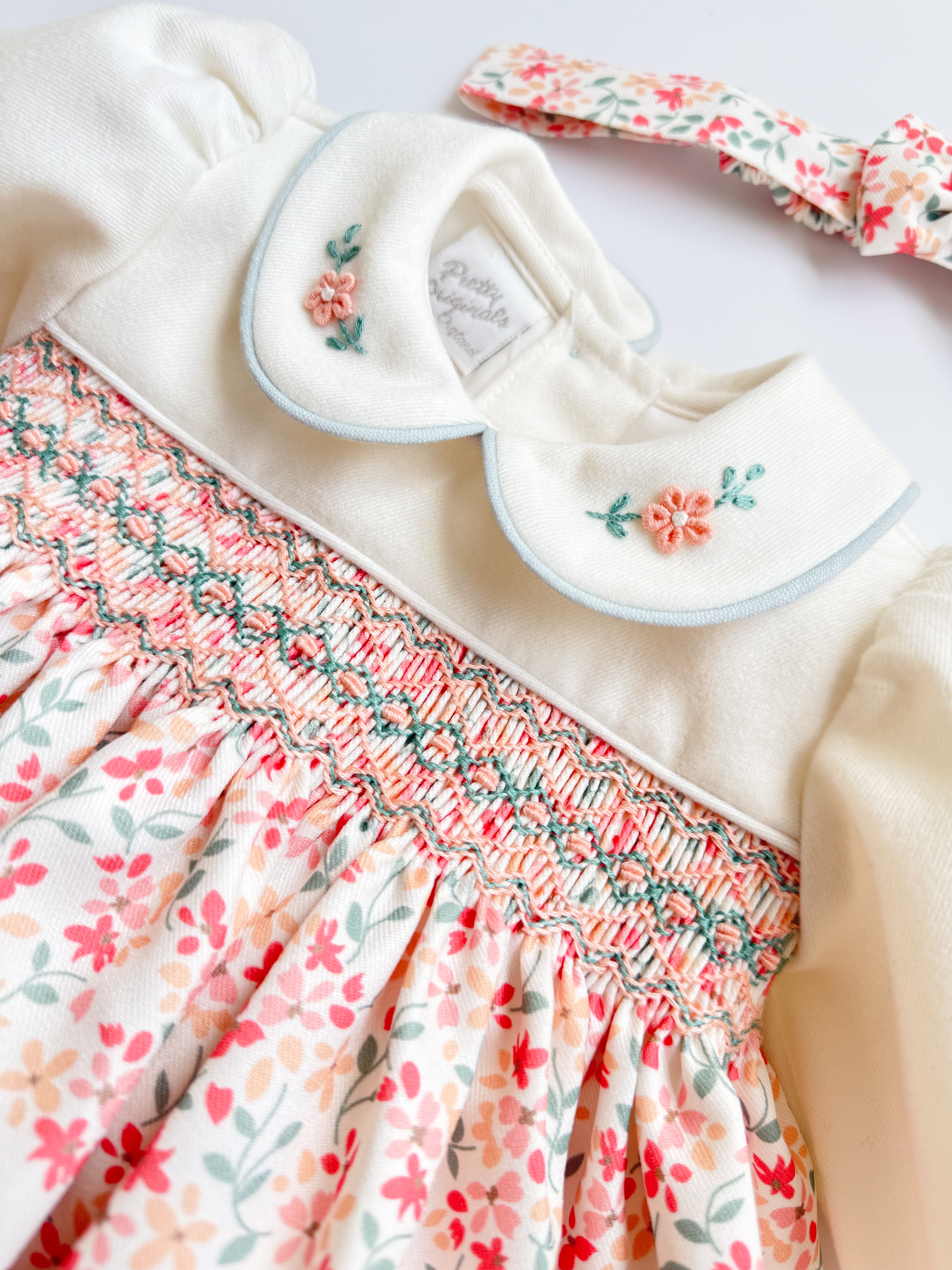 Pretty Originals Cream/Peach Floral Smocked Dress