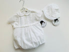 Beautiful cotton shirt romper with cap , intricate pale blue embroidery on both .