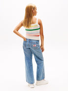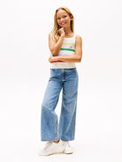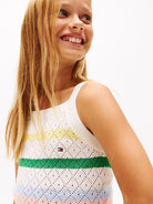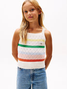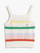 This strappy tank top features a diamond crochet design and colourful stripes, making it a striking sunny-day piece.