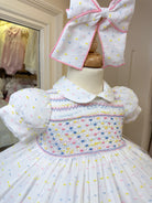 We just love the springtime feel of this stunning dress , SWISS PLUMETTI COTTON in pure white , with sprinkles of the sweetest colours in pastel dots , icecream sprinkle VIBES🍦give it the title & it's totally scrumptious , just look at the matching hand smocked detail too , so fresh & summery , extra full , stunning Swiss plumetti cotton , added tulle to the petticoat , bow back , ONLY THE BEST FROM NAXOS 🌸🤍🍦🌸🤍